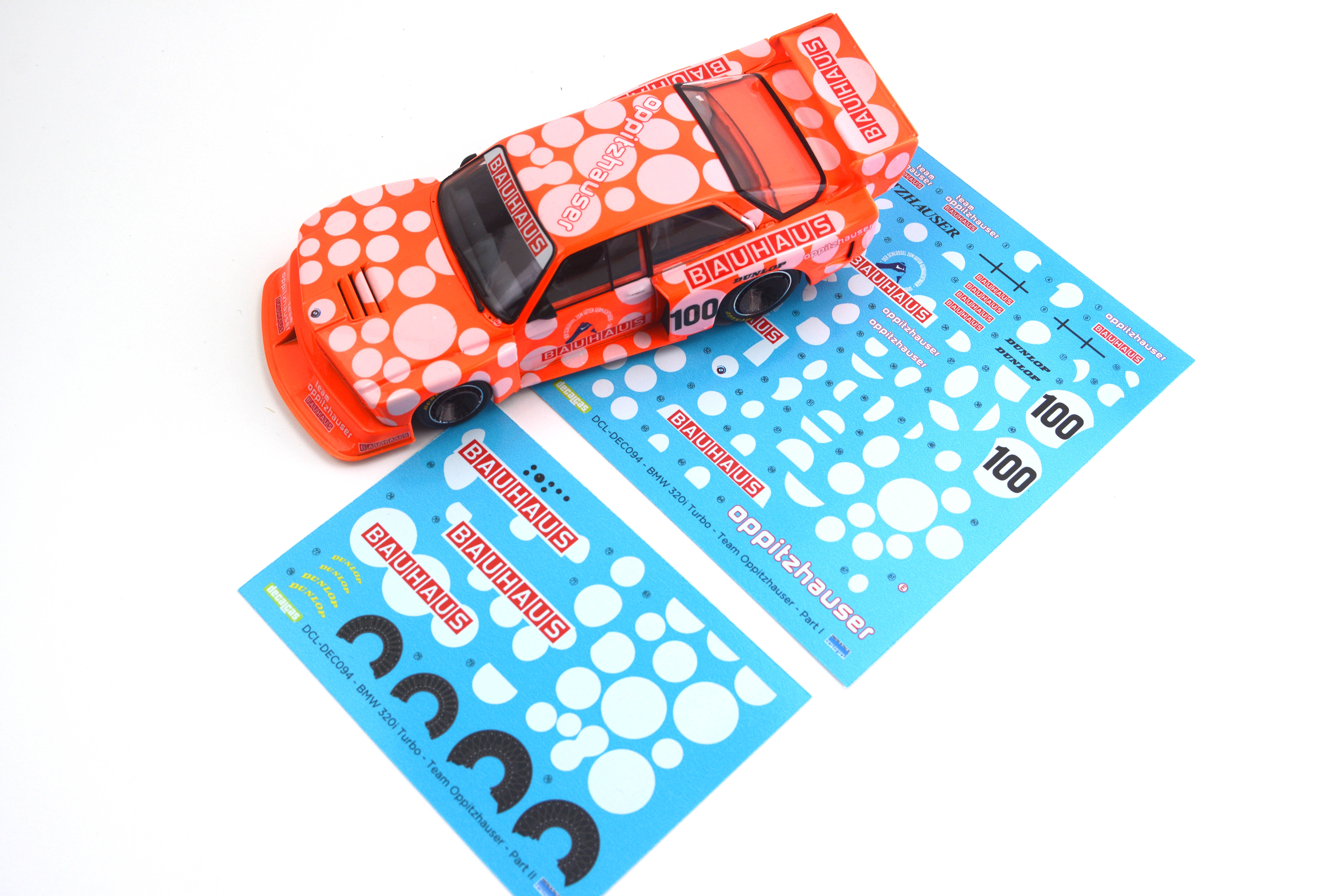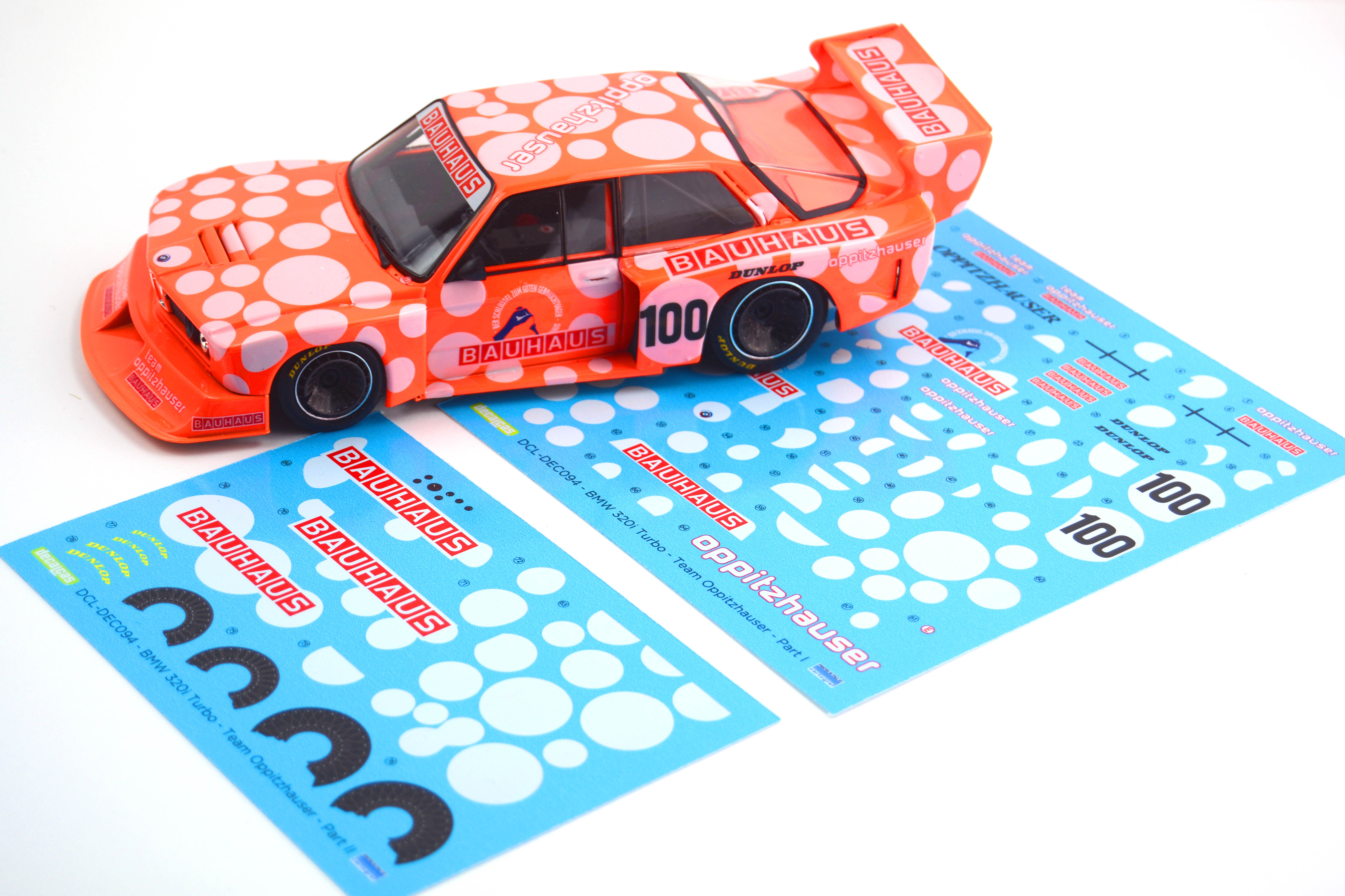 Following the rule change in the DRM regulations, driver Karl Oppitzhauser acquired one of the last units of the BMW 320 E21 Turbo, which he competed in all kinds of events, including some hill climbs. Its unusual white polka dot livery was undoubtedly eye-catching... almost as much as it will be on your kit. This livery allows for a reproduction of the car, already sponsored by Bauhaus, during its participation in the 1984 FIA Interserie European Cup support race held at the Erding circuit in Germany.