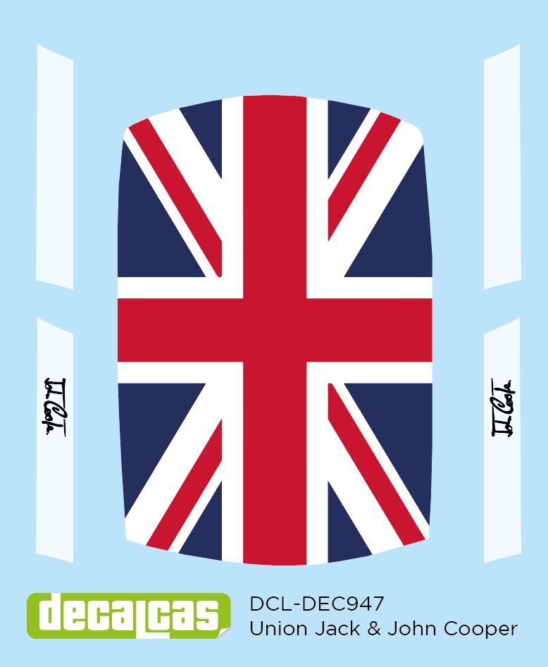 Marking / livery for 1/24 scale models: Union Jack and John Cooper for Mini Cooper 1.3 (ref. DCL-DEC947)