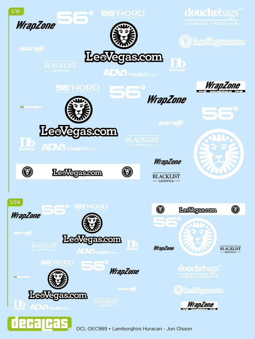 Decal sheet including the logos to recreate the 2015 Jon Olsson Lamborghini Huracan LP610-4. The sheet includes this livery in both 1/24 and 1/18 scale, so you can decorate both a scale model and a diecast.