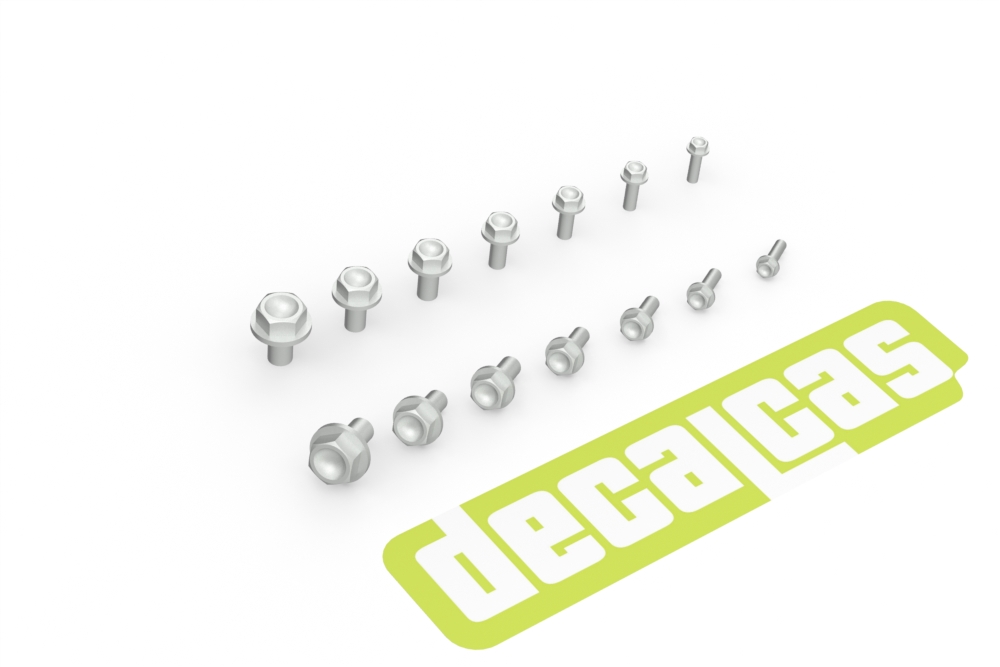 Set of 600 light weight hexagonal head bolts with stamped flange with diameters of 0.5mm, 0.6mm, 0.7mm, 0.8mm, 1mm and 1.2mm (100 units of each of the different sizes), with which to detail any part or piece of your models where these types of screws are found. With the usual quality of
