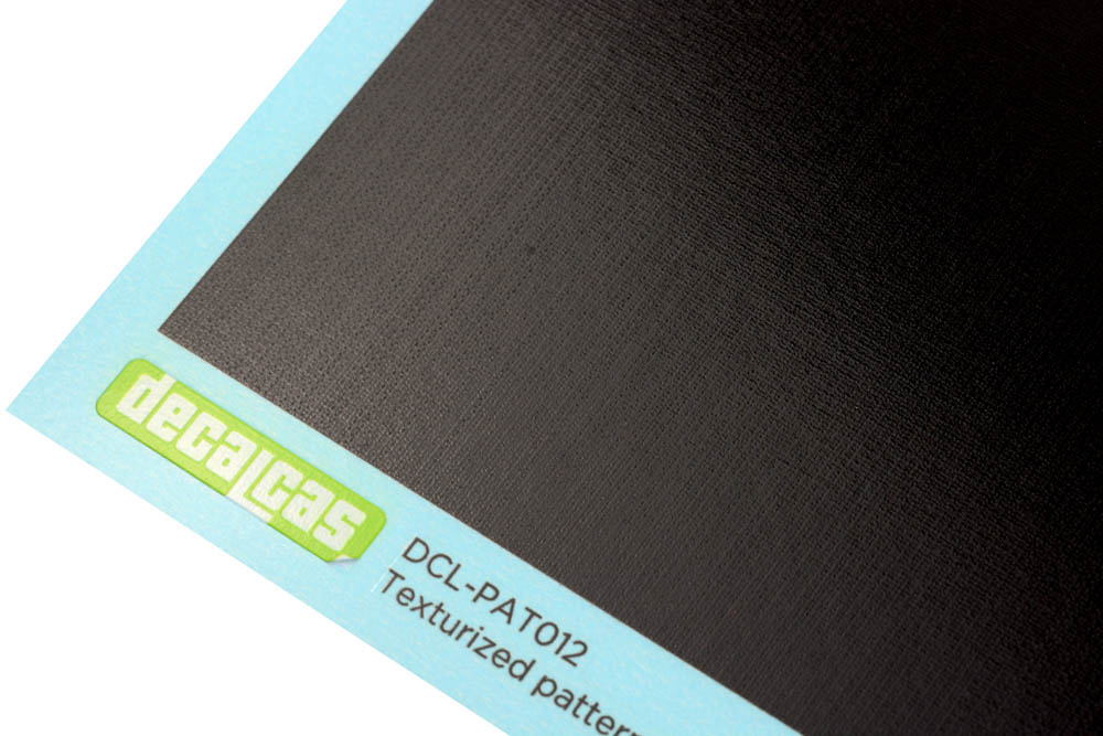 Black decal, featuring a very thick texture with a lot of personality and presence, designed for adding very noticeable roughness. It can even be used to simulate linear carbon fiber in 1/12 scale.